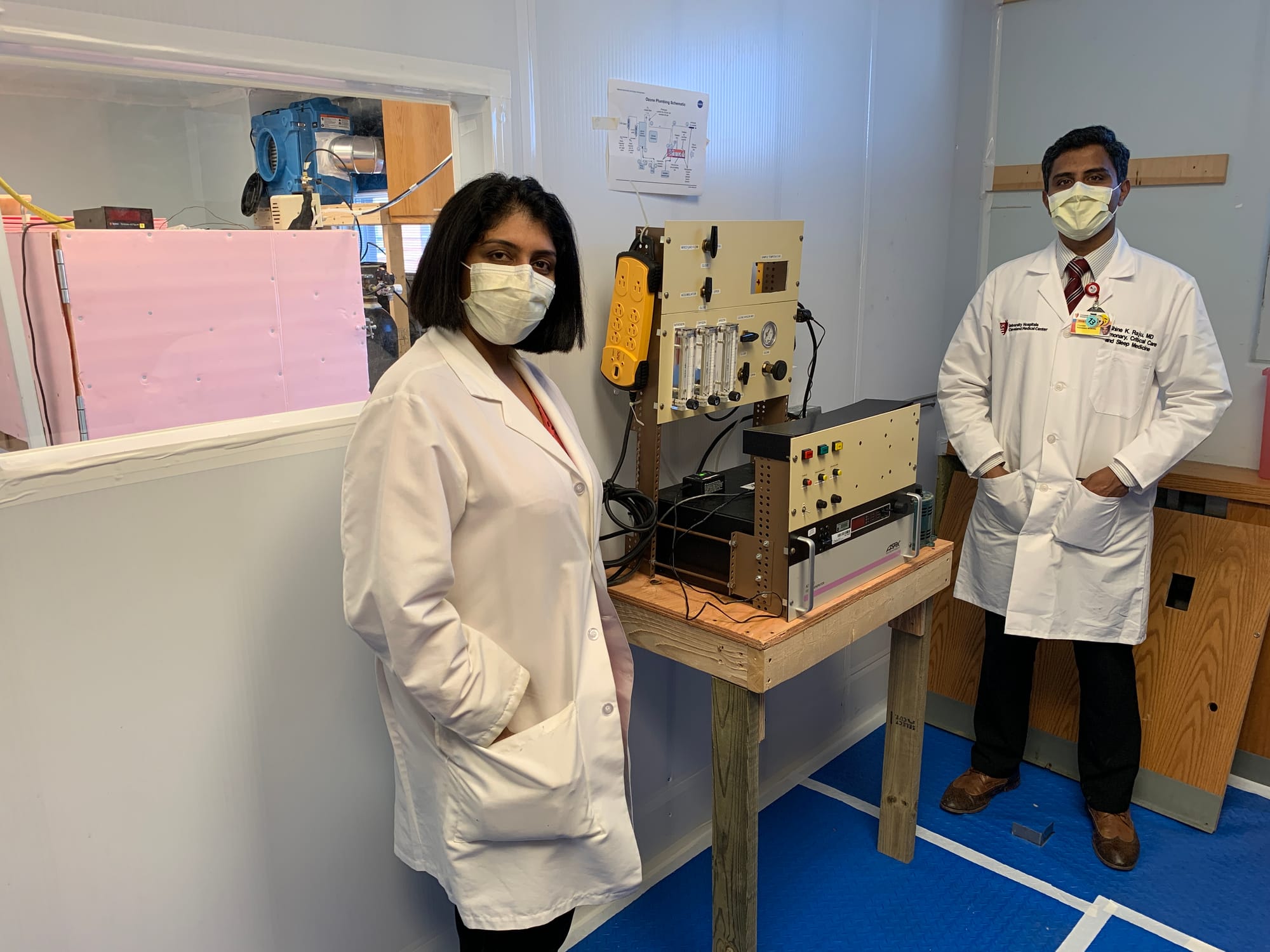 Doctors Amrita John and Shine Raja at UH Cleveland Medical Center with the device that decontaminates masks using atomic oxygen.